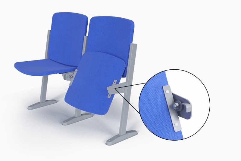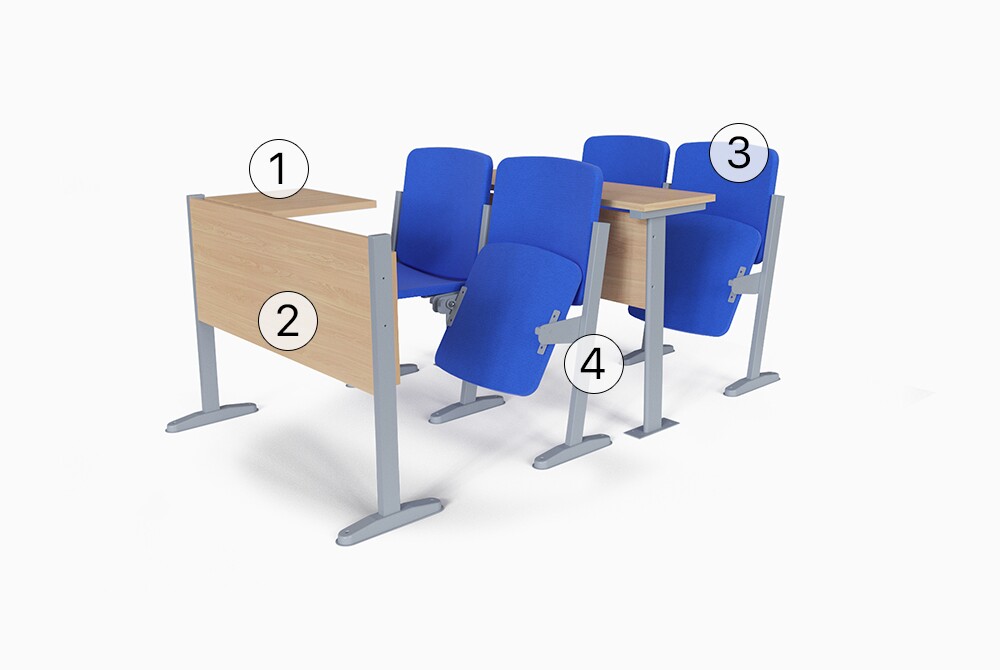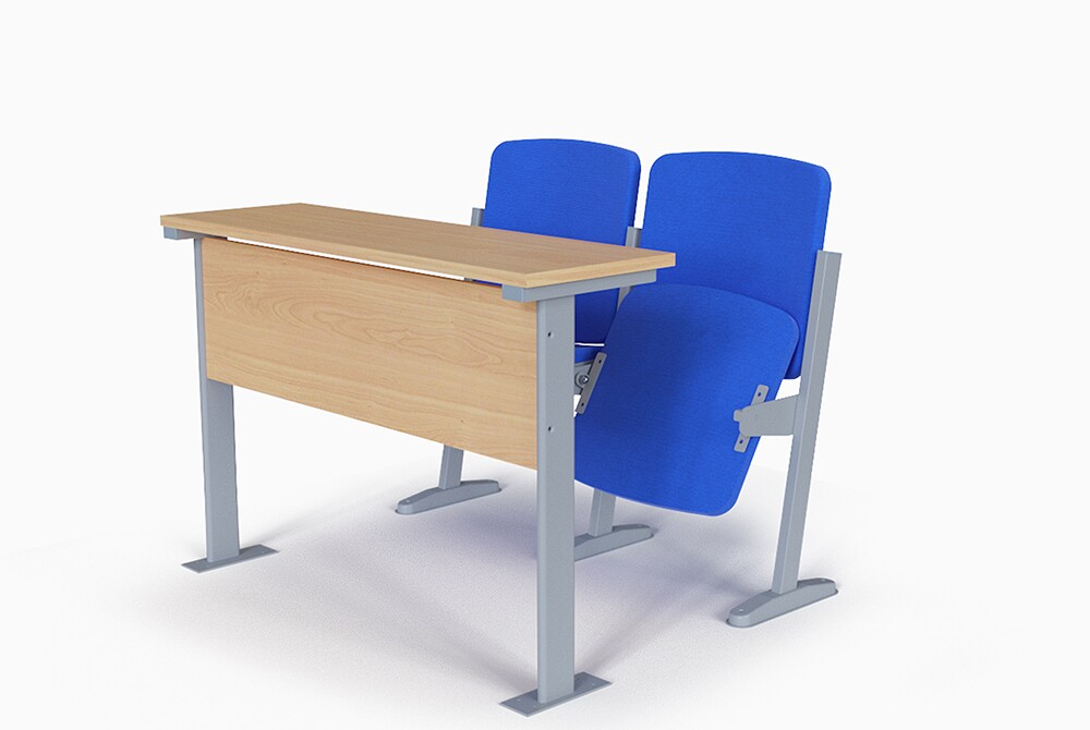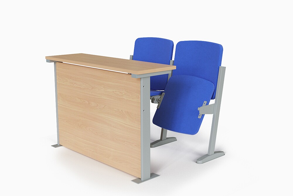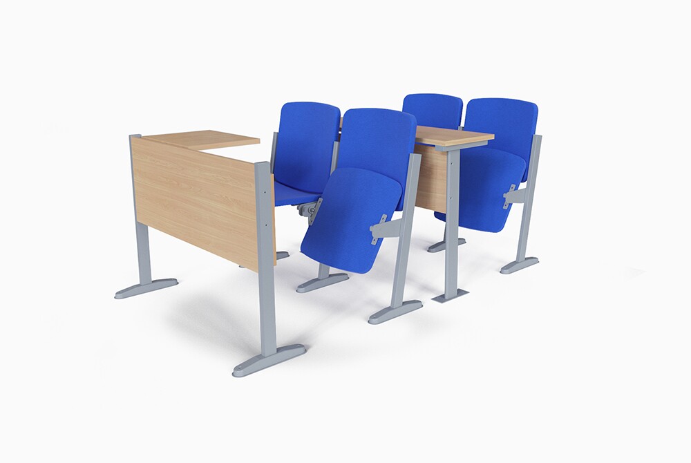 В основании конструкции модели "Гамма" блок сидений с гравитационным механизмом возврата. Комплектуется аудиторным столом с монолитной столешницей или откидными столиками